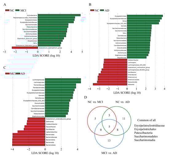 To further analyze the subtle change in microbiota, LEfSe and LDA were performed. Several taxa showed different abundance in specific between-group comparisons: 15 taxa between NC and MCI (Figure 3A), 29 taxa between NC and AD (Figure 3B), and 26 taxa between MCI and AD (Figure 3C). The Venn diagram demonstrated the commonly changed bacteria between each comparison pair.