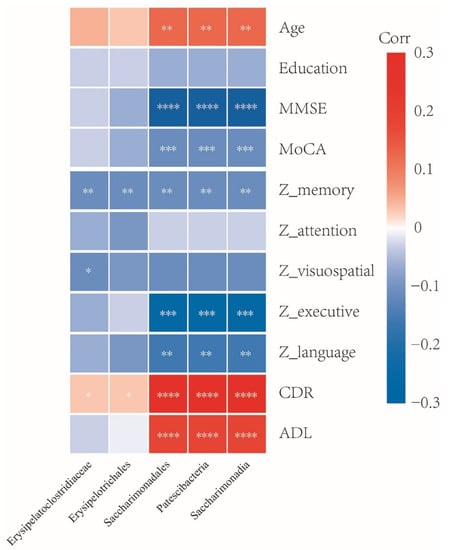 Correlations between the five specific taxa and clinical characteristics. The correlation coefficients (Corr) are displayed. Red or blue signified positive or negative correlation, respectively. MMSE, Mini-mental State Examination; MoCA, Montreal Cognitive Assessment; ADL, Activities of Daily Living; CDR, Clinical Dementia Rating; The composite Z scores were computed for specific cognitive domains including memory, attention, visuospatial ability, language, and executive function. * p < 0.05, ** p < 0.01, *** p < 0.001, **** p < 0.0001.