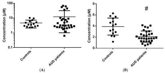 Fasting blood sampling was performed at treatment entry in the addiction department. Most AUD patients (n = 27) underwent a second blood sampling to measure nutritional markers such as serum albumin and prealbumin at the end of the acute alcohol withdrawal phase. Fasting blood sampling was performed at the inclusion for HC. Serum samples were stored at −80 °C up to analysis.