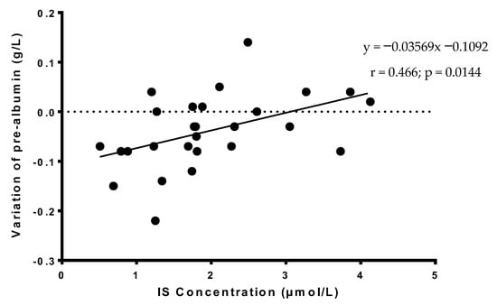 Considering the nutritional status, we showed in this study that IS level at treatment entry was a significant positive predictor of variation of serum prealbumin during alcohol withdrawal. Prealbumin is considered as a biomarker assessing denutrition and the efficiency of renutrition: an increase is observed in patients when renutrition is appropriated. In our study, serum prealbumin seems to decline during alcohol withdrawal in most AUD patients, probably reflecting metabolic changes during this period. However, the lower IS concentration at treatment entry, the more severe the decline of serum prealbumin concentration. These data encourage the identification of AUD patients with the lowest IS concentrations at treatment entry. They would require additional and specific nutritionist intervention associated with a personalized refeeding program and follow-up examinations during alcohol withdrawal.
