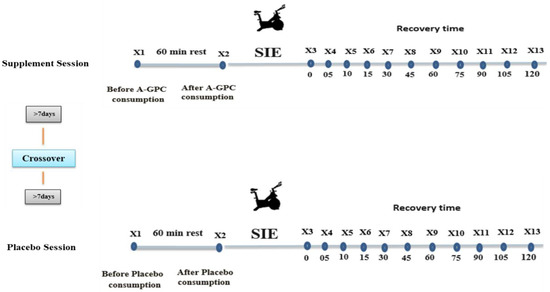 The first session was designed to familiarize participants with the Wingate test, A-GPC consumption, and other study procedures. In this session, height (Seca, HamburgGermany), body weight, body mass index (BMI), body fat percentage (BF%), and fat-free mass (FFM) were measured by the bio-impedance analyzer (X-Scan Inbody 770, Medigate Company Inc., Dan-dong Gunpo City, South Korea). In the second session, participants arrived at the laboratory in a fasting state (8 h) between 07:30 to 08:00 a.m. in the early follicular phase of menstruation (confirmed through calendar self-reporting method before participation). Participants consumed A-GPC (1000 mg) or a placebo after eating breakfast in a randomized, double-blind cross-over design with a one-week wash-out period between supplement and placebo trials. After consuming A-GPC or placebo, participants were seated for 60 min in a quiet room (temperature between 22 and 23 °C). Thereafter, they performed the SIE protocol. HRV was measured immediately after exercise and every 15 min up to 120 min during recovery. BP was measured immediately after exercise, every 5 min during the first 15 min of recovery, and afterwards every 15 min up to 120 min during recovery (Figure 1).