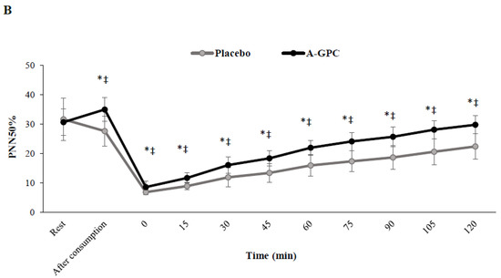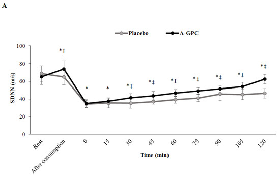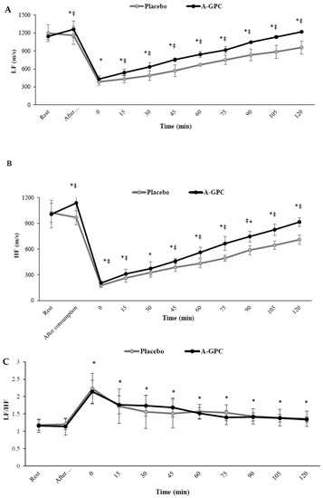 There were significant interactions (p < 0.05) between session and time for SDNN (F(2.9,32.4) = 11.2, p = 0.001, ES = 0.50, power = 0.99) (Figure 2A), pNN50% (F(2.5,28) = 9.2, p = 0.001, ES = 0.45, power = 0.98) (Figure 2B), HF (F(2.0,22.8) = 11.7, p = 0.001, ES = 0.51, power = 0.98) (Figure 3B), and LF (F(2.9,32.4) = 28.9, p = 0.001, ES = 0.72, power = 1.0) (Figure 3A). A-GPC consumption increased (p < 0.05) resting levels of SDNN (%14) (Figure 2A), pNN50% (%14) (Figure 2B), LF (%10) (Figure 3A), and HF (%13) (Figure 3B) compared to the placebo (Figure 2 and Figure 3). In both the A-GPC and placebo sessions these HRV variables decreased (p < 0.05) immediately after the SIE protocol, whereas, they increased during recovery to a greater level in the A-GPC than in the placebo session. There was a significant main effect of time for the LF/HF ratio (F(2.8,31.7) = 41.6, p = 0.001, ES = 0.79, power = 1.0) (Figure 3C). Independent of the trials (A-GPC or placebo), LF/HF (p < 0.05) increased immediately after the SIE protocol and decreased during 120 min recovery. However, there were no significant interactions between session and time for the LF/HF ratio (p > 0.05) (Figure 3C).