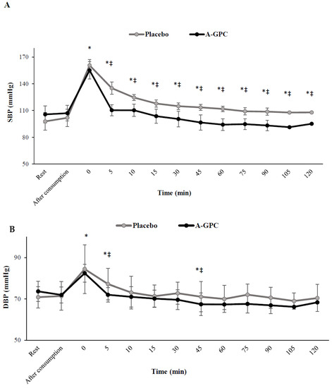 Systolic (A) and diastolic (B) blood pressure at baseline, 60 min after Choline or placebo consumption immediately after exercise and every 5 min during first 15 min and afterward every 15 min. SBP, Systolic Blood Pressure; DBP, Diastolic Blood Pressure. Values are means ± SD. * indicates a significant difference from baseline (p < 0.05); ‡ indicates a significant difference from placebo session (p < 0.05).