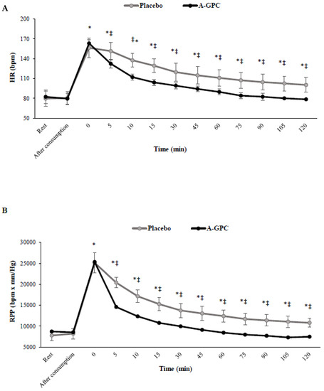Heart rate (A) and Rate Pressure Product (B) at baseline, 60 min after choline or placebo consumption immediately after exercise and every 5 min during first 15 min and afterward every 15 min. HR, Heart Rate; RPP, Rate Pressure Product. Values are means ± SD. * indicates a significant difference from baseline (p < 0.05); ‡ indicates a significant difference from placebo session (p < 0.05).