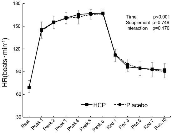 The HR response from rest to recovery and the peak values adapted in proportion to the changes in the work rate (time effect: F(11, 99) = 625.470, p ˂ 0.001, η2 = 0.986) and showed no significant difference between the HCP and placebo groups during the HIIT protocol, as illustrated in Figure 2.