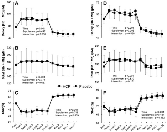 Group mean values for the rectus femoris (RF) muscle deoxygenated hemoglobin and myoglobin concentration (deoxy[Hb + Mb]) (A), the total hemoglobin and myoglobin concentration (total[Hb + Mb]) (B), and tissue O2 saturation (StO2) (C). The vastus lateralis (VL) muscle deoxy[Hb + Mb] (D), total[Hb + Mb] (E), and StO2 (F) at rest, peak values during the 7 s all-out bout for each set (Peak.1~6), and the recovery period (Rec.1~10) in the HCP and placebo groups. Error bars: SD. Overall values in the RF and VL muscles showed no significant difference between the groups.