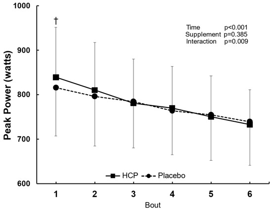 The peak power (PP) showed a significant difference between the HCP and placebo groups (interaction effect: F(5, 45) = 3.560, p = 0.009, η2 = 0.283). The PP increased significantly in the first bout with HCP compared to the placebo, 839 ± 112 W vs. 816 ± 108 W, p = 0.001. However, no significant difference was observed after that from bouts 2 to 6 (Figure 4).