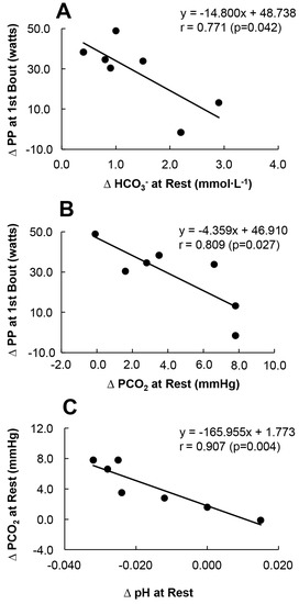 The relationship between changes in the peak power (PP) at the 1st bout (ΔPP (HCP−Placebo)) and changes in the HCO3− value at rest (ΔHCO3− (HCP−Placebo)) (A), the ΔPP at the 1st bout and changes in the PCO2 at rest (ΔPCO2 (HCP−Placebo)) (B), and the ΔPCO2 at rest in relation to the changes to pH at rest (ΔpH (HCP−Placebo)) (C) in the HCP group. Note that the sample size was 7 subjects. Higher changes in ΔHCO3− and ΔPCO2 at rest were significantly negatively correlated with ΔPP at the 1st bout (r = 0.771, p = 0.042 and r = 0.809, p = 0.027, respectively), and the change in pH at rest was sensitive mainly to changes in PCO2 (r = 0.907, p = 0.004).