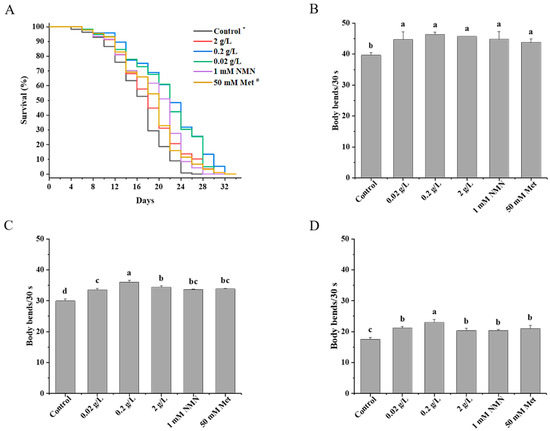 The wild-type N2 strain and CF1038 (daf-16(mu86)) were selected for use in this experiment. All strains were cultured on nematode growth medium (NGM) inoculated with Escherichia coli OP50 strain at 20 °C [24]. All the strains were provided by Anhui Normal University (Wuhu, China). Synchronized worms were grown until the L4 stage. They were washed with M9 buffer and collected by centrifugation [25]. To prepare QBLP-supplemented food, appropriate amounts of QBLP (0.02, 0.2, and 2 g/mL) were dissolved in the NGM. Then, the collected worms were exposed to different concentrations of QBLP. QBLP was provided by Yunnan Laodianhuang Food Co., Ltd. (Kunming, China). Briefly, 4-day-old QBL was used for homogenization with JTM-60 Colloid Mill (Shenyang Xiangyang Colloid Mill Factory, Shenyang, China), and then the TS8606 Vacuum Freeze Dryer (Jiamao Wandeford Biotechnology Co., Ltd., Dongying, China) was used to dry QBL. The vacuum degree was 0.3 MPa. The temperature was 60 °C and lyophilized for 24 h. Finally, QBLP was obtained. Control was used in which no additional QBLP was added to the medium. Two positive controls were used in which 1 mM Nicotinamide mononucleotide (NMN) (Shanghai Yuanye Bio-Technology Co., Ltd., Shanghai, China) or 50 mM metformin hydrochloride (Shanghai Yuanye Bio-Technology Co., Ltd., Shanghai, China) was added to the medium.