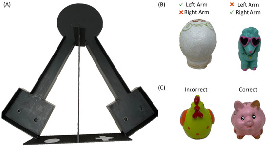Behavioral testing apparatus and objects utilized for BAT and object discrimination tasks. (A) Birds-eye view of the testing apparatus used for alternations, BAT, and object discrimination tasks. Note during the object discrimination, only one arm of the maze was used, and rats were not required to alternate. Objects utilized during (B) BAT. In the left arm of the maze the white skull was rewarded when selected while the blue poodle was the correct in the right arm. Thus, the correct response updated based on spatial location. Objects used for (C) simple object discrimination testing. The pig was the correct choice.