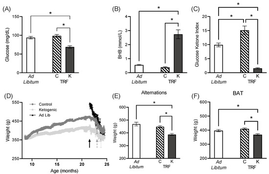 Over the course of time-restricted feeding, both ketogenic and control-fed rats gained a significant amount of weight (F[1,18] = 378.50; p < 0.001), indicating that they were not calorically restricted. Although caloric intake was identical, the control-fed rats gained significantly more weight that the ketogenic diet-fed rats (F[1,18] = 7.08; p = 0.02). Moreover, the interaction between time and diet group was significant (F[1,18] = 67.09; p < 0.001), indicating that the control-fed rats also gained weight more rapidly. Although this observation suggests that rats were not calorically restricted, weights did not reach the level of ad libitum-fed animals of the same age (Figure 2D). The control and ketogenic intermittent fasting groups reached maximal weights that were on average 472 and 421 g, respectively, compared to an average maximal weight of 547 g in the ad libitum-fed rats. This is likely because rats with unrestricted access to food overconsume, which could be related to the excessive visceral fat and metabolic impairments that have been reported for aged male rats of this strain [13,17].