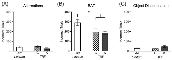 The number of incorrect trials required to reach criterion performance on BAT testing was significantly different across the diet groups (F[2,28] = 4.48; p = 0.02; Figure 3B). These results were due to the time-restricted feeding from young adulthood rather than dietary macronutrient composition, as the method of feeding also had a significant effect on performance (F[1,30] = 194.07; p < 0.001). Ad libitum fed rats required significantly more trials to reach criterion performance than ketogenic diet-fed rats (t[1,28] = 2.63; p = 0.04) and a strong trends towards significantly more trials than control-fed rats (t[1,28] = 2.38; p = 0.07). Conversely, among the rats that were given time-restricted feeding from young adulthood into old age, there was no difference in performance between the ketogenic and control diet groups (t[28] = 0.22; p > 0.99).