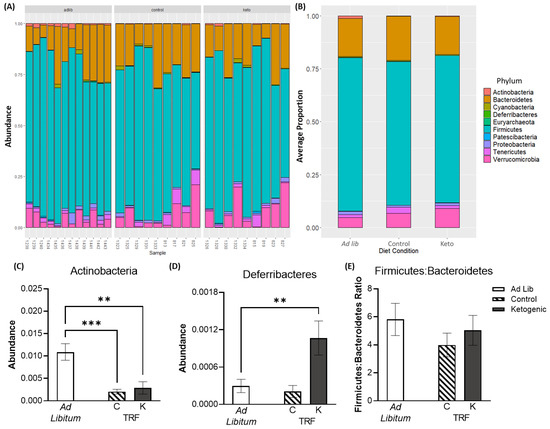 At the phylum taxonomic level (Figure 4A,B), two phyla were found to significantly differ across diet groups: actinobacteria (F[2,27] = 11.49; p < 0.001) and deferribacteres (F[2,27] = 7.39; p = 0.002). While both TRF groups had significantly reduced abundance of actinobacteria relative to the ad libitum fed group (p < 0.01 for both comparisons), only the ketogenic diet fed TRF group had significantly higher levels of deferribacteres than the ad libitum fed group (t[27] = 3.30; p = 0.006; Figure 4C) but not the control TRF fed group (t[27] = 0.38; p > 0.99). No other phyla differed by diet group or feeding paradigm (p > 0.19 for all comparisons), nor did the ratio of firmicutes to bacteroidetes differ (p > 0.30 for both comparisons; Figure 4E). In addition to broad changes at the phylum level, additional analyses (see ANCOM below) were conducted at the genus level (Supplementary Figure S1) to assess more detailed differences in gut microbiome composition.