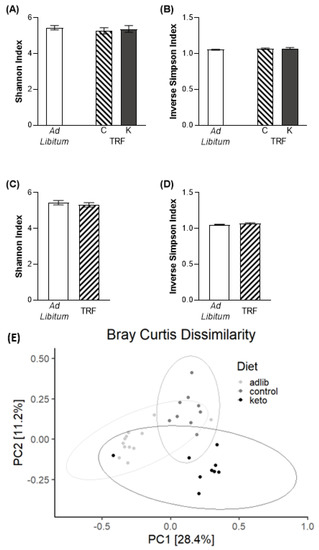 Two common measures of alpha diversity, the Inverse Simpson (IS) index [40], which measures the dominances of a multispecies community [40] and Shannon’s (S) index, which takes taxa richness into account [41], were utilized. There were no differences across groups in alpha diversity by either measure, whether separated by dietary macronutrient composition (S: F[2,27] = 0.37, p = 0.72; IS: F[2,27] = 1.32, p = 0.28; A,B) or by feeding paradigm (S: t[28] = 0.67, p = 0.51; IS: t[28] = 1.58, p = 0.13; Figure 5C,D).