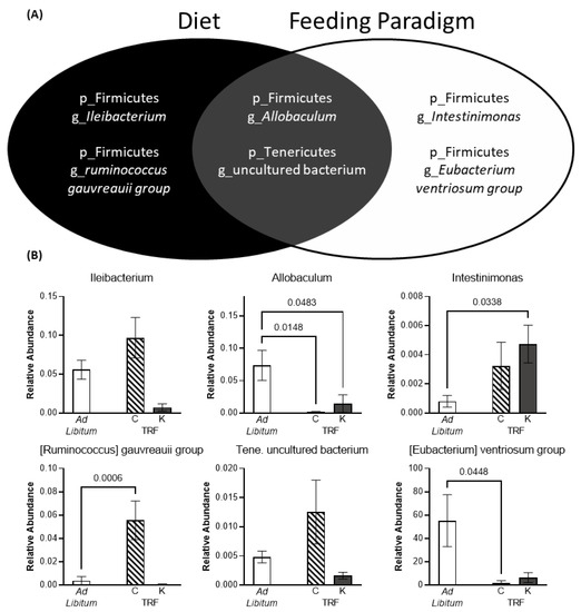 Significantly altered genera identified utilizing the analysis of composition of microbiomes (ANCOM) methodology. (A) 6 genera were identified to be significantly different across the different diet and/or feeding paradigm groups. (B) Relative abundance of the identified genera. All data are group means ± 1 SEM.