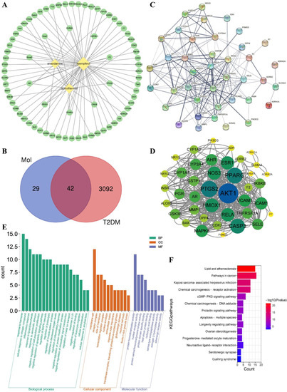 Network construction of ingredients−targets (A) and common targets Venn diagram of ingredients and T2DM (B), the “diamond” nodes represent the active ingredients. The “ellipse” nodes represent the potential targets. Protein−protein interaction (PPI) network analysis of potential targets of active ingredients−T2DM by STRING platform (C), and the high interaction modules analyzed by Centiscape 2.2 plug−in (D), the node size and color represented the connectivity degree. Gene ontology (GO) analysis (E) and Kyoto encyclopedia of genes and genomes (KEGG) pathway enrichment analysis (F) of active ingredients−T2DM potential targets.