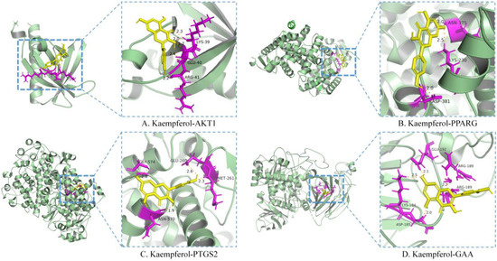 Kaempferol was the only flavonoid of the active ingredients screened by network pharmacology analysis. Molecular docking was used to simulate the binding of kaempferol to the potential key targets AKT1, PPARG, and PTGS2. α−Glucosidase is a class of enzymes associated with glucose metabolism, and α−glucosidase (GAA, PDB ID: 5NN4) was also used as a receptor. Autodock (v.4.2.6) software was used to conduct molecular docking. The diagrams of ligand and potential target docking results are shown in Figure 4. It showed that kaempferol could bind to ARG−41, GLU−40, and LYS−39 residues of AKT1, the binding energy was −6.42 kcal·mol−1. The binding energy of kaempferol with GAA residues (ASP−185, LYS−184, GLU−192, and ARG−189) was −5.58 kcal·mol−1. The residues were binding sites for kaempferol on proteins. Detailed information on ligands and potential targets is listed in Table S2.