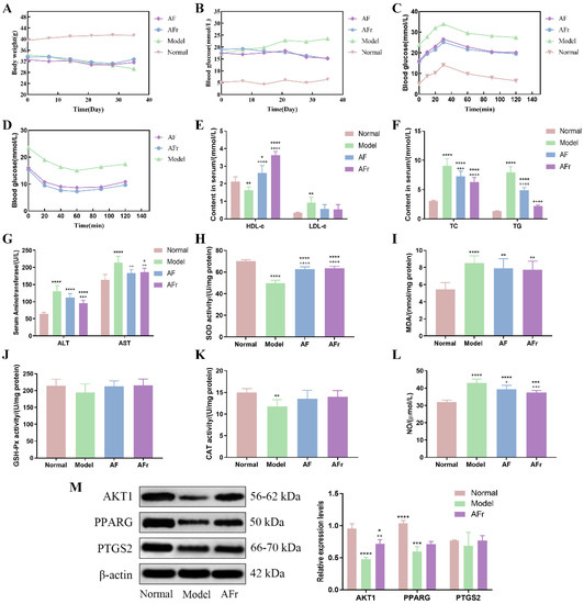 Effects on body weight (A), fasting blood glucose (FBG, B), oral glucose tolerance test (OGTT, C), insulin tolerance test (ITT, D), high/low−density lipoprotein cholesterol (HDL−c & LDL−c, E), total cholesterol & triglyceride (TC &TG, F), alanine aminotransferase & aspartate aminotransferase (ALT & AST, G), superoxide dismutase (SOD, H), malonaldehyde (MDA, I), glutathione peroxidase (GSH−Px, J), catalase (CAT, K), and nitric oxide (NO, L) (six mice per group). The expression levels of RAC−alpha serine/threonine−protein kinase (AKT1), peroxisome proliferator activated receptor gamma (PPARG), and prostaglandin G/H synthase 2 (PTGS2) proteins in liver tissue (M), data were shown as mean ± SD (n = 3). (compared to the normal group, * p < 0.05, ** p < 0.01, *** p < 0.005, **** p < 0.001; compared to the model group, + p < 0.05, ++ p < 0.01, +++ p < 0.005, ++++ p < 0.001).