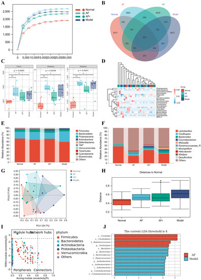 To investigate the species differences among samples, beta diversity analysis was performed on all samples. Principal coordinates analysis (PCoA) and the between−group difference analysis (Figure 7G,H) were performed based on weighted unifrac. The results showed that the contribution of PCo1 was 24.7%, and PCo2 was 17.6%. The samples of the four groups were significantly different, especially between the normal group and the model group. The AFr group was closer to the normal group than the AF group. The between−group difference analysis results intuitively reflected the similarity and variability between samples. It could be seen that the gut microbiota of the normal group significantly differed from the model group, and the similarity of the gut microbiota between the two treatment groups was higher. And the distances between the two treatment groups and the normal group were closer than that between the treatment groups and the model group. This was consistent with the results of the PCoA analysis.