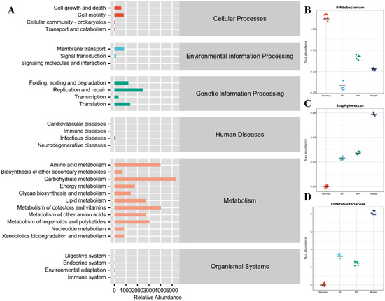 Metabolic pathways enrichment (A), and species composition difference analysis at the genus level between groups: (B) Bifidobacterium, (C) Staphylococcus, and (D) Enterobacteriaceae.