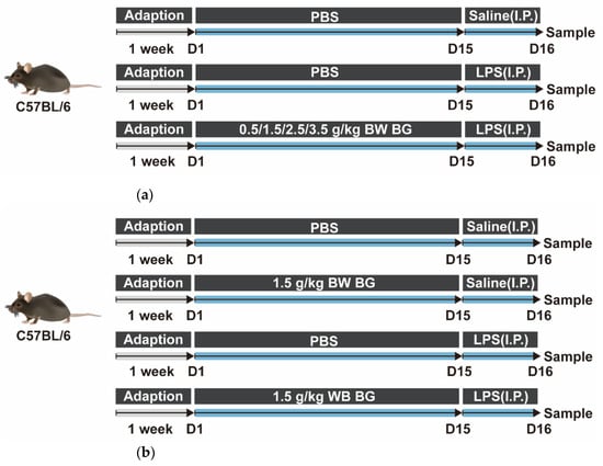 Schematic for the experimental design. (a) Dosage screening trial of BG for alleviating intestinal inflammation and barrier dysfunction in LPS-stimulated mice; (b) Effects of 1.5 g/kg BW BG on intestinal inflammation and barrier dysfunction in mice challenged by LPS.