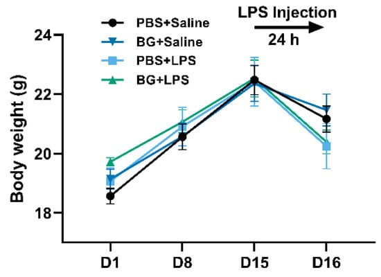 Changes of body weight during the experiment. PBS+Saline, mice administered PBS and injected with saline; BG+Saline mice administered 1.5 g/kg BW BG and injected with saline; PBS+LPS, mice administered PBS and injected with LPS; BG+LPS, mice administered 1.5 g/kg BW BG and injection with LPS. Data are presented as mean ± SEM, n = 6. An unpaired t-test was used for statistical analysis between two groups.