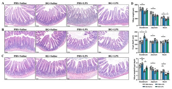 LPS injection significantly decreased the duodenum villus height and duodenum villus height to crypt depth ratio and increased the duodenum crypt depth (p < 0.05, Figure 3A,D). LPS stimulation significantly decreased the jejunum villus height and jejunum villus height to crypt depth in mice (p < 0.05, Figure 3B,D). BG administered at 1.5 g/kg BW attenuated the increase in duodenum crypt depth (p < 0.05, Figure 3A,D). BG administration (at 1.5 g/kg BW) did not help in the attenuation of the jejunum injuries (p > 0.05, Figure 3B,D). Under saline intraperitoneal injection, there were no significant differences in morphology or histological index of the duodenal structures between the PBS+Saline and BG+Saline groups (p > 0.05, Figure 3A,D). There were no significant differences in morphology or histological index of jejunal structures between the PBS+Saline and BG+Saline groups (p > 0.05, Figure 3B,D). Compared to the PBS+Saline group, LPS stimulation decreased the ileum villus height in PBS administered mice (p < 0.05, Figure 3C,D), however, when administered BG the ileum villus height decrease induced by LPS stimulation was attenuated (p < 0.05, Figure 3C,D). Under saline intraperitoneal injection, BG administration significantly increased the ileum villus height to crypt depth ratio in mice (p < 0.05). These results can be observed in Figure 3C.