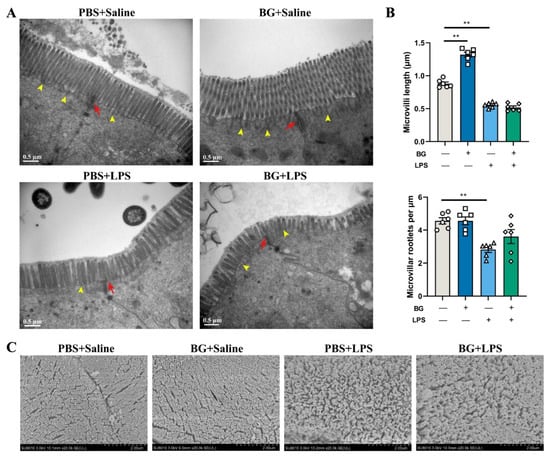 Attenuating effects of BG on the ultrastructure of jejunal epithelial cells in mice induced with LPS intraperitoneal injection. (A) Transmission electron microscope images of ileum epithelial cells (scale bar = 0.5 μm); (B) jejunum epithelial cells microvilli length and average microvilli rootlet densities. “+” and “−” mean with and without corresponding treatments, respectively. (C) Jejunum epithelial cells scanning electron microscope images (20,000×). Yellow arrowheads designate rootlet ends, and red arrows designate tight junction structures. PBS+Saline, mice administered PBS and injected with saline; BG+Saline mice administered 1.5 g/kg BW BG and injected with saline; PBS+LPS, mice administered PBS and injected with LPS; BG+LPS, mice administered 1.5 g/kg BW BG and injected with LPS. Data are presented as mean ± SEM, n = 6. ** indicate significant difference (p < 0.01). An unpaired t-test was used for statistical analysis between two groups.