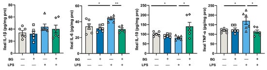 As shown in Figure 7, LPS injection decreased the ileal IL-10 level and increased the IL-6 and TNF-α levels in mice intragastrically administered PBS, however, this was remitted in the BG intragastric administered mice (p < 0.05). Moreover, there were no significant differences in the level of IL-1β between the groups (p > 0.05).