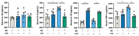As shown in Figure 8, no significant differences were observed in the levels of IL-1β and IL-10 in serum between mice injected with LPS or saline. However, LPS injection significantly increased TNF-α and IL-6 in the serum of mice intragastrically administered with PBS (p < 0.05). Nonetheless, BG alleviated their increase (p < 0.05, p < 0.01) and increased the levels of serum IL-10 (p < 0.01). Mice from the BG intragastric administration group, compared with the mice with intragastric administration of PBS, showed significantly increased levels of serum IL-10 (p < 0.01), while the levels of IL-1β exhibited no significant differences (p > 0.05).