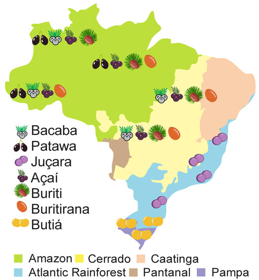The consumption of native fruits in tropical regions has been growing due to their antioxidant, anti-inflammatory, and hypocholesterolemic activity claims [14,15,16,17]. These effects have been related to their high content of vitamins, carotenoids, and polyphenols [18,19]. These fruits are usually consumed in natura or used as ingredients to make jam, ice cream, juice, and fermented drinks. However, except for açaí, the commercialization of fruits of native Brazilian species is not very impressive. Most of them are destined for regional trade or are cultivated specifically for landscape purposes [20,21,22]. The uses, chemical and biological characteristics, and potential applications of seven native fruits of the Arecaceae family are presented and discussed in this review. The volume of production, economic potential, and studies reported in the literature were the parameters considered to choose the fruits. Studies published in Portuguese, English, and Spanish between 1990 and 2022 were selected. Nutritional composition, bioactive compounds, antioxidant activity, antimicrobial properties, and effects on health were the key words used as research target. Scopus®, Web of Science Core Collection, Google Scholar, Scielo, and Global Biodiversity Information Facility (GBIF) were used as research databases. The distribution of bacaba, patawa, juçara, açaí, buriti, buritirana, and butiá in the Brazilian biomes Amazon, Cerrado, Caatinga, Pantanal, Atlantic Forest, and Pampa are shown in Figure 1. The ethnobotanical characteristics, nutritional composition, minerals, lipid profile, amino acids, bioactive compounds, and the health benefits of these fruits are presented and discussed in the following sections.