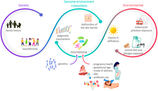 Any effective preventive strategy must rely on accurate identification of the individuals at risk; in fact, primary prevention approaches often consist of the modulation of one (or more) modifiable risk factors. As in many other medical conditions, allergies’ risk factors are multifactorial and involve genetic traits, environmental aspects, and a complex pattern of genome-environment interactions. Those most commonly related to food allergies, atopic dermatitis and asthma are summarised in Figure 1 [1,3,5,6,7]. Some of these risk factors are immutable, as is the case of familial associations, race/ethnicity, and, to some extent, skin barrier dysfunction; others, however, can be at least partially modulated as part of a preventive approach. The latter include vitamin D insufficiency, diet (including timing and route of exposure to certain food allergens), exposure to air pollution and tobacco smoke, certain aspects related to the dysfunction of the skin barrier (such as the physical effect elicited by scratching), and the composition of the epidermal, respiratory, and gastrointestinal microbiota. The family history and the composition of the microbiota were deemed as two of the most important risk factors by the scientific panel present on the advisory boards; the former is readily identifiable and has a considerable weight in the development of allergies, whereas the latter is increasingly acknowledged as one of the key aspects that mediates the acquisition of immune tolerance, as well as a potential target of several preventive strategies. As such, these risk factors will be further explained in the next sections.