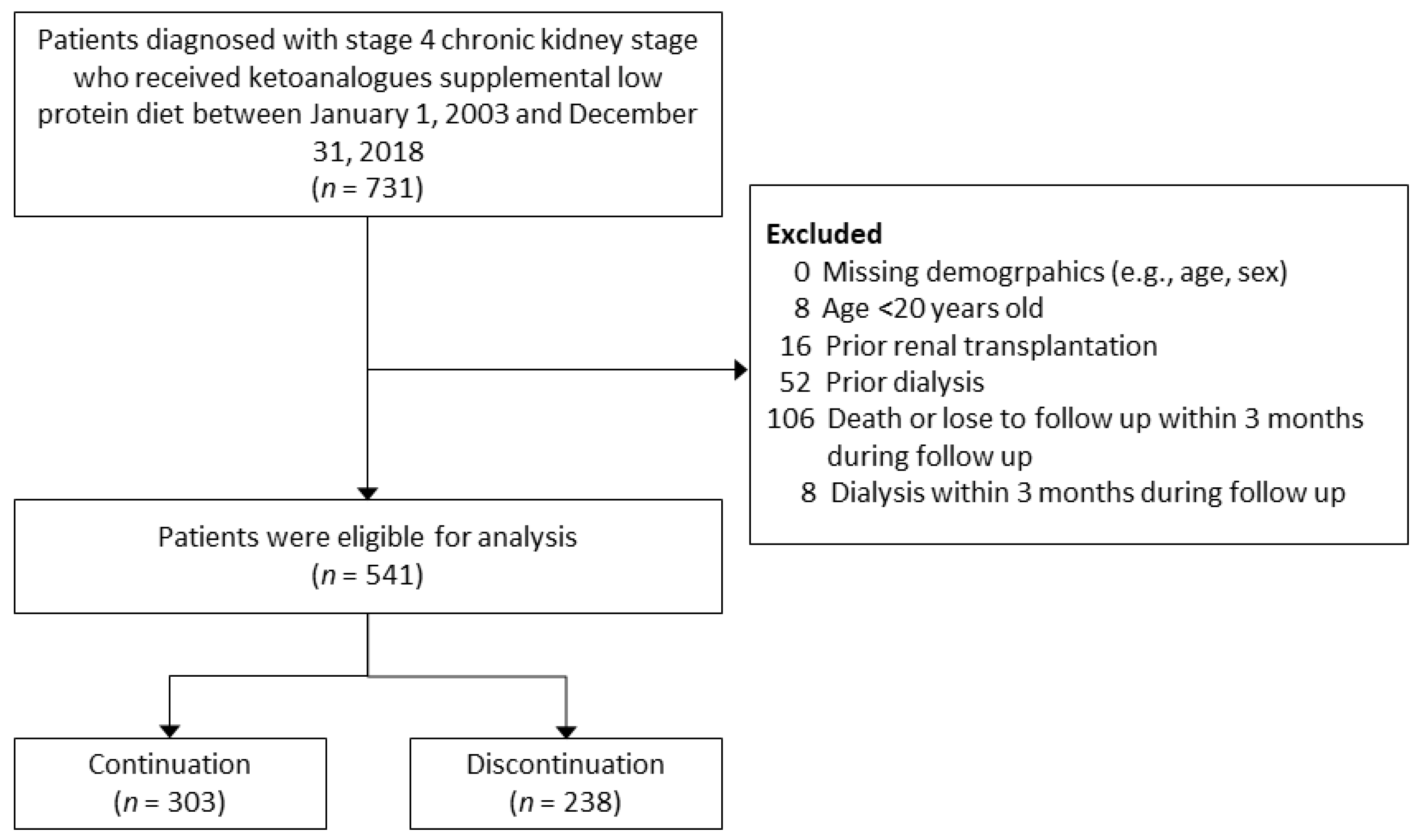 APA StyleYen, C.-L., Fan, P.-C., Chen, J.-J., Kuo, G., Hsiao, C.-C., Chen, C.-Y., Tu, Y.-R., Hsu, H.-H., Chen, Y.-C., & Chang, C.-H. (2022). Ketoanalogues Supplemental Low Protein Diet Safely Decreases Short-Term Risk of Dialysis among CKD Stage 4 Patients. Nutrients, 14(19), 4020. https://doi.org/10.3390/nu14194020