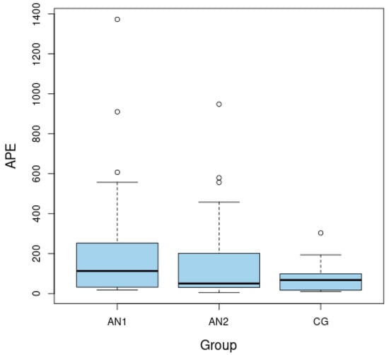 Analyses were conducted in statistical software R, version 4.1.3. All variables measured in a study were quantitative ones. The normality of distributions was checked with Shapiro–Wilk’s test and with skewness value. Dependent samples (AN1 and AN2 groups) were compared using Student’s t-test for dependent groups (paired t-test) or Wilcoxon’s test. Independent samples (AN groups and control group) were compared with Student’s t-test for independent groups or Mann–Whitney’s U test. The AN1 and AN2 groups represent a group of the same patients tested at different time points, which precluded the use of an ANOVA test. Spearman’s rho coefficient was used for correlation analyses as it is resistant to outliers and non-normal distributions. Scatter plots were made to show the direction of significant relationships between APE-13 or ASP and other selected variables. Regression models were not built as the assumption about the linear relationship between predictors and the dependent variable was not met. Statistical analysis was based on a significance level of 0.05.