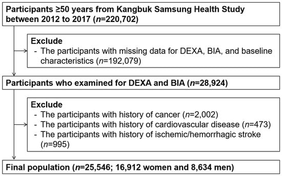 The study participants were adults aged over 50 years who underwent both bioelectrical impedance analysis (BIA) and dual energy X-ray absorptiometry (DXA) from 1 January 2012 to 31 December 2017 (n = 220,702). Participants who met the exclusion criteria were as follows: (1) missing data for baseline characteristics (n = 192,079), (2) history of malignancy (n = 2,002), (3) history of cardiovascular disease (n = 995), and (4) history of ischemic or hemorrhagic stroke (n = 47). Some participants met one or more exclusion criteria, leaving 25,546 participants included in the final analysis (Figure 1). The study protocol was performed in accordance with the Declaration of Helsinki and was approved by the Institutional Review Board (IRB) of Kangbuk Samsung Hospital (IRB no. KBSMC 2021-12-047). The requirement for prior consent was waived by the IRB as we accessed anonymized datasets collected regularly as part of the health screening exam.