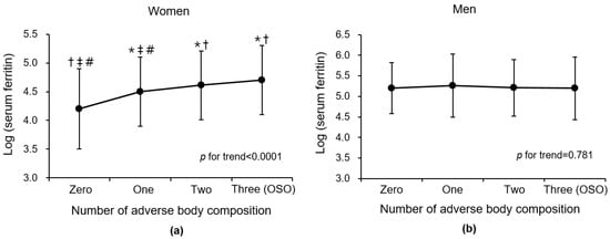 Comparison of mean (±SD) log-transformed ferritin according to number of adverse body compositions (osteoporosis/osteopenia, muscle mass loss, and obesity) in (a) women and (b) men. Abbreviations: OSO, osteosarcopenic obesity; SD, standard deviation. * p < 0.05 versus zero group in post hoc analysis. † p < 0.05 versus one group in post hoc analysis. ‡ p < 0.05 versus two group in post hoc analysis. # p < 0.05 versus three group in post hoc analysis.