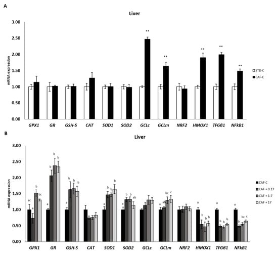 mRNA expression in liver. All values are means ± standard error of the mean (SEM). Differences between rats fed standard (STD) diet and supplemented with vehicle (STD-C, n = 8) and rats fed cafeteria (CAF) diet and supplemented with vehicle (CAF-C, n = 8) (A) were assessed by using Student’s t parametric test (t test) for independent samples: **, significantly different compared to the STD-C group (p < 0.01). Differences among CAF-C rats, rats fed CAF diet and supplemented with 0.17 mg kg−1 body weight (bw) per day of TetraSOD® (CAF + 0.17, n = 8), rats fed CAF diet and supplemented with 1.7 mg kg−1 bw of TetraSOD® (CAF + 1.7, n = 8) and rats fed CAF diet and supplemented with 17 mg kg−1 bw of TetraSOD® (CAF + 17, n = 8) (B) were evaluated by the ANCOVA test, using the percentage of body fat in the 8th week (before treatment) as a covariable: abc letters indicate statistically significant differences among the CAF groups (p < 0.05). CAT, catalase; GCLc, glutamate–cysteine ligase, catalytic subunit; GCLm, glutamate–cysteine ligase, modifier subunit; GPx1, glutathione peroxidase 1; GR, glutathione reductase; GSH-S, glutathione synthetase; HMOX1, heme oxygenase 1; NFκB1, nuclear factor kappa B subunit 1; NRF2, nuclear factor, erythroid 2-like 2; SOD1, superoxide dismutase 1; SOD2, superoxide dismutase 2; TGFβ1, transforming growth factor beta 1.