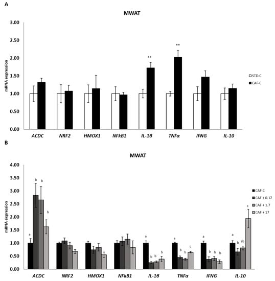 mRNA expression in MWAT. All values are means ± standard error of the mean (SEM). Differences between rats fed standard (STD) diet and supplemented with vehicle (STD-C, n = 8) and rats fed cafeteria (CAF) diet and supplemented with vehicle (CAF-C, n = 8) (A) were assessed by using Student’s t parametric test (t test) for independent samples: **, significantly different compared to the STD-C group (p < 0.01). Differences among CAF-C rats, rats fed CAF diet and supplemented with 0.17 mg kg−1 body weight (bw) per day of TetraSOD® (CAF + 0.17, n = 8), rats fed CAF diet and supplemented with 1.7 mg kg−1 bw of TetraSOD® (CAF + 1.7, n = 8) and rats fed CAF diet and supplemented with 17 mg kg−1 bw of TetraSOD® (CAF + 17, n = 8) (B) were evaluated by the ANCOVA test, using the percentage of body fat in the 8th week (before treatment) as a covariable: abc letters indicate statistically significant differences among the CAF groups (p < 0.05). ACDC, adiponectin; HMOX1, heme oxygenase 1; IFNG, interferon gamma; IL-1β; interleukin 1 beta; IL-10; interleukin 10; NFκB1, nuclear factor kappa B subunit 1; NRF2, nuclear factor, erythroid 2-like 2; TNFα, tumour necrosis factor alpha.