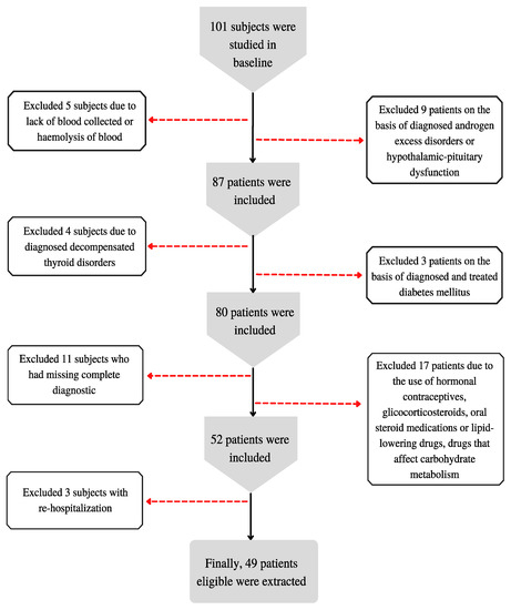 Exclusion criteria were as follows: the patient’s lack of consent to participate in the study; condition after implantation of cardiac pacemaker; pregnancy; lower limbs prostheses; foot dressings; no blood collected as part of routine or haemolysis of the blood; use of hormonal contraceptives, glicocorticosteroids, oral steroid medications or lipid-lowering drugs, or drugs that affect carbohydrate metabolism; previously diagnosed and treated diabetes mellitus; decompensated thyroid disorders; androgen excess disorders (congenital or late-onset Cushing’s disease/syndrome, congenital adrenal hyperplasia, androgen-secreting tumors, idiopathic hirsutism, hyperprolactinemia); depressive disorders and treatment of depression; diagnostic incomplete; re-hospitalization.