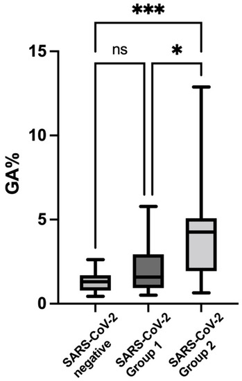 Figure 3 shows the scatterplot and comparison of the GA levels (medians and interquartile ranges) of SARS-CoV-2 groups 1 and 2 and the SARS-CoV-2-negative controls with multiple post hoc comparisons. The group 2 patients showed the highest values for GA compared to both the group 1 patients and the control group.