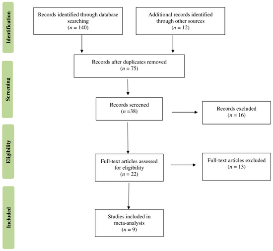 The first systematic search of the literature yielded 152 entries. After excluding duplicates, 75 were classified as potentially relevant and selected for the title and abstract analysis. Then, 37 were excluded for failure to meet the characteristics of the approach or the review goal. After reviewing the full text of the remaining 38 records, only 9 met the inclusion criteria and were included in the meta-analysis [15,16,17,18,19,20,21,22,23]. The Preferred Reporting Items for Systematic Reviews and Meta-analyses (PRISMA) flow chart illustrating the number of studies at each stage of the review is shown in Figure 1. The final study base included nine articles reporting zinc deficiency prevalence by IBD condition (CD, UC).