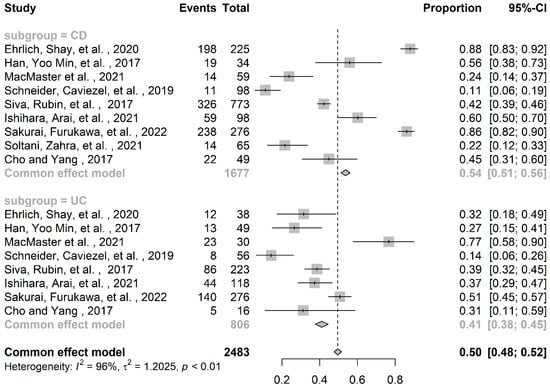 The present systematic review and meta-analysis aimed to provide a revised estimate of the prevalence of zinc deficiency in IBD populations, without restrictions as to the country, patients age, and study design. We clustered the 17 entries from the nine studies conducted in three different countries (Asia, Europe, and America) that had reported single prevalence data by type of IBD within the population examined. To the best of our knowledge, no meta-analytic report has yet been published in the literature on this topic. Given the growing concern about the management of individuals with chronic malabsorption diseases, zinc deficiency in CD and UC is among the major sensitive issues. As the main finding, this meta-analysis produced an overall zinc deficiency estimate of 50% (95%CI 0.48–0.52), with high heterogeneity I2 = 96% and a moderate to low risk of bias across selected reports. Funnel plot analysis showed no evidence of publication bias. The clustered meta-analysis by the IBD group (CD and UC) showed a higher overall prevalence of zinc deficiency in the CD group than in the UC group (54%, 95%CI 0.51 to 0.56, versus 41%, 95%CI 0.38 to 0.45). In fact, while CD is known to affect any part of the gastrointestinal tract, including the mouth, esophagus, stomach, small and large intestines, rectum, and anus, UC compromises the colon and rectum. Moreover, the more malabsorptive CD affects all layers of the intestinal wall discontinuously, whereas in UC, the inflammation occurs in the innermost lining of the intestinal wall and is a continuous stretch within the colon.