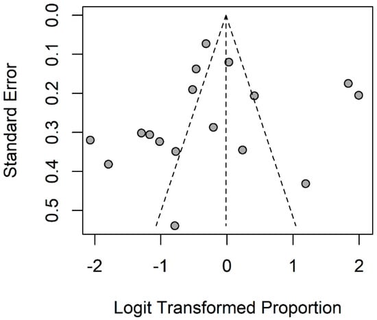 The quality of the studies included in the meta-analysis was evaluated using a tool developed by Hoy and colleagues [13]. Each study was assigned a score of one (yes) or zero (no) for each of the ten criteria. Based on the total score, studies were categorized as having a low (>8), moderate (6–8), or high (≤5) risk of bias. Disagreements between the two investigators on the methodological quality of the included studies were addressed by discussion, involving a third investigator in the final agreement (RS). All data analyses were performed using R, version 2021.09.1; our biostatistician (FC) used the meta-package to conduct meta-analyses of the zinc deficiency prevalence (%), subdivided according to IBD illness type (CD, UC). A common-effects model was used to calculate the prevalence and 95% confidence intervals (CI) (Figure 1 and Figure 2). The Higgins and colleagues [14] I2 test was used to estimate percentage heterogeneity between studies that cannot be explained by chance. The closer this value is to zero, the less the variability between studies. Negative values are comparable to zero and indicate that there is no heterogeneity. Values below 25% suggest a low, between 25% and 50% moderate, and above 50% high heterogeneity among studies. The funnel plot shown in Figure 3 was used as a visual tool when investigating publication bias. The horizontal axis shows the scatter of treatment effects estimated from individual studies, while the vertical axis shows study size.