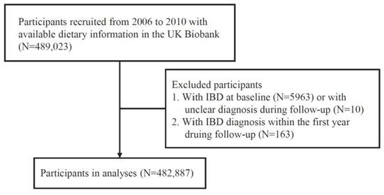 Participants with available dietary information were included (N = 489,023). In addition, participants with IBD at baseline (N = 5963) or an uncertain IBD diagnosis during follow-up (N = 10) were excluded. We also excluded participants with a diagnosis of IBD within the first year during follow-up (N = 163) to reduce reverse causation. Finally, 482,887 participants were included in the analysis (Figure 1).