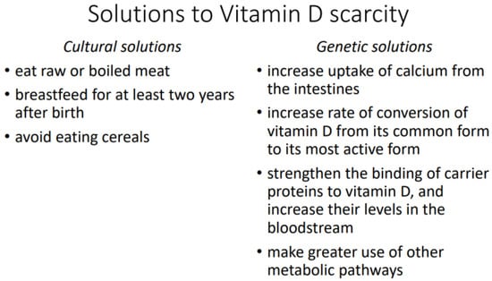 Dark-skinned peoples are thus faced with a problem of vitamin D scarcity. Unlike Arctic peoples, they do not solve it by means of cultural practices, at least not at the present time. Meat provides a small proportion of the caloric intake in sub-Saharan Africa and is normally cooked, and cereals like sorghum and millet have long been consumed despite their high levels of phytic acid [44,45]. On the other hand, extended breastfeeding may have been formerly common [46] (p. 15), [47] (pp. 6–7).