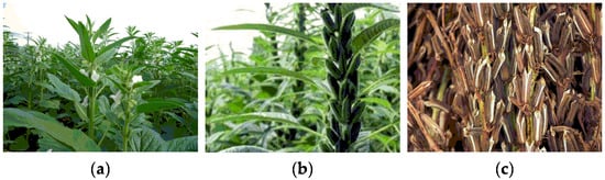Different growth states of sesame. (a) Sesame blooming; (b) unripe sesame pods; (c) ripe sesame pods.