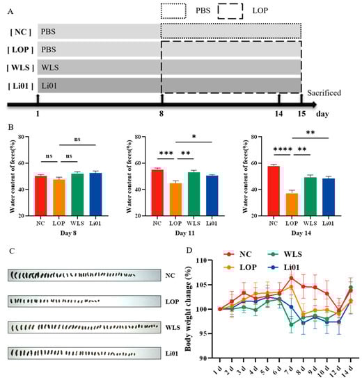 Changes in fecal characteristics and body weight in mice with loperamide-induced constipation (LOP) after treatment with Ligilactobacillus salivarius Li01 (Li01), Weileshu probiotic (WLS), and the control group (NC). (A) Flow chart of the animal experiments. (B) Water content of feces on the 8th, 11th, and 14th day. (C) Fecal morphology after induction of constipation. (D) Body weight changes of mice in the different experimental groups. Data are presented as mean ± SEM, n = 6. Significant differences are denoted by “ns” (p ≥ 0.05), * (p < 0.05), ** (p < 0.01), *** (p < 0.001), and **** (p < 0.0001).