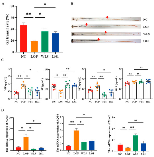 Previous research has found that one of the main causes leading to hard and dry stool is reduced gut motility, which may promote the accumulation of intestinal contents so that the intestinal absorption of water and electrolytes increases [30]. GI peristalsis includes coordinated contraction and relaxation of the intestinal muscle, participating in the formation of most gut propulsion motility [3]. GI transit rate can be used to evaluate the GI peristalsis in mice. According to the results shown in Figure 2A,B, the GI transit rate dramatically decreased in the LOP group (p < 0.01) compared with the NC group. Interestingly, compared to the LOP group, the GI transit rate was significantly higher in the Li01 (p < 0.05) and WLS groups (p < 0.05), indicating that oral administration of both Li01 and WLS increased the gut motility in constipated mice.