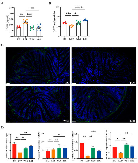 Several studies have reported elevated 5-HT levels in the colonic tissues of constipated patients [41,42], whereas other studies have found that the deficiency of 5-HT is related to prolonged gastric emptying [43]. To investigate the changes in levels of 5-HT in constipated mice, we quantified 5-HT both in serum and colonic tissues. As shown in Figure 4A, the serum 5-HT level of the LOP mice was remarkably higher than that of the NC mice (p < 0.01), indicating that loperamide increased the serum levels of 5-HT. Compared to the mice in the LOP group, significantly decreased serum levels were observed in mice treated with Li01 (p < 0.01) and WLS (p < 0.001). The 5-HT serum levels in mice treated with Li01 and WLS were similar to those in the NC group. Colonic 5-HT levels, on the other hand, while significantly reduced in mice with loperamide-induced constipated mice compared to mice in the NC group (p < 0.001), were higher in mice treated with Li01 (p < 0.05) and WLS (p < 0.0001) compared to mice in the LOP group (Figure 4B).