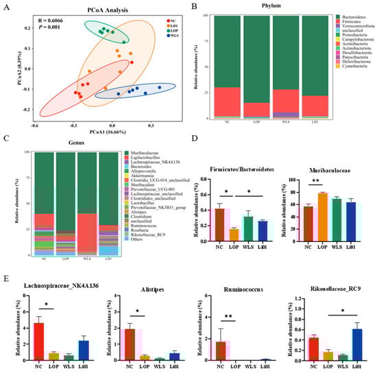 Alteration of the gut microbiota composition of mice in the normal, control group (NC), loperamide-induced constipation group (LOP), Weileshu probiotic group (WLS), and Ligilactobacillus salivarius Li01 group (Li01). The relative abundance of the gut microbiota at the phylum level (A) and the genus level (B) is shown for the different groups. (C) β-diversity was evaluated by a principal components analysis (PCoA) of unweighted unifrac distance. (D,E) The gut microbiota composition of mice in the NC group and the LOP group detected by 16S rRNA gene sequencing. Data are presented as mean ± SEM, n = 6. Significant differences are denoted by * (p < 0.05), and ** (p < 0.01).